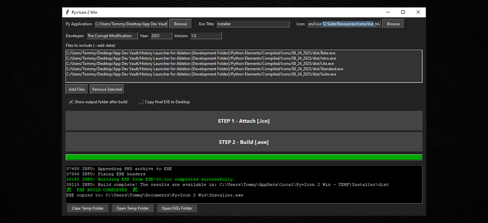 I wanted a tool that would create EXEs for me out of Python code. Problem was - Getting all the images, icos, and other exes for bundles, and stuff in the same folder - or writing out the full expressions of the exact filepath, forunning a PyInstall in CMD prompt, from the folder.... It was cumbersome, to say the least.